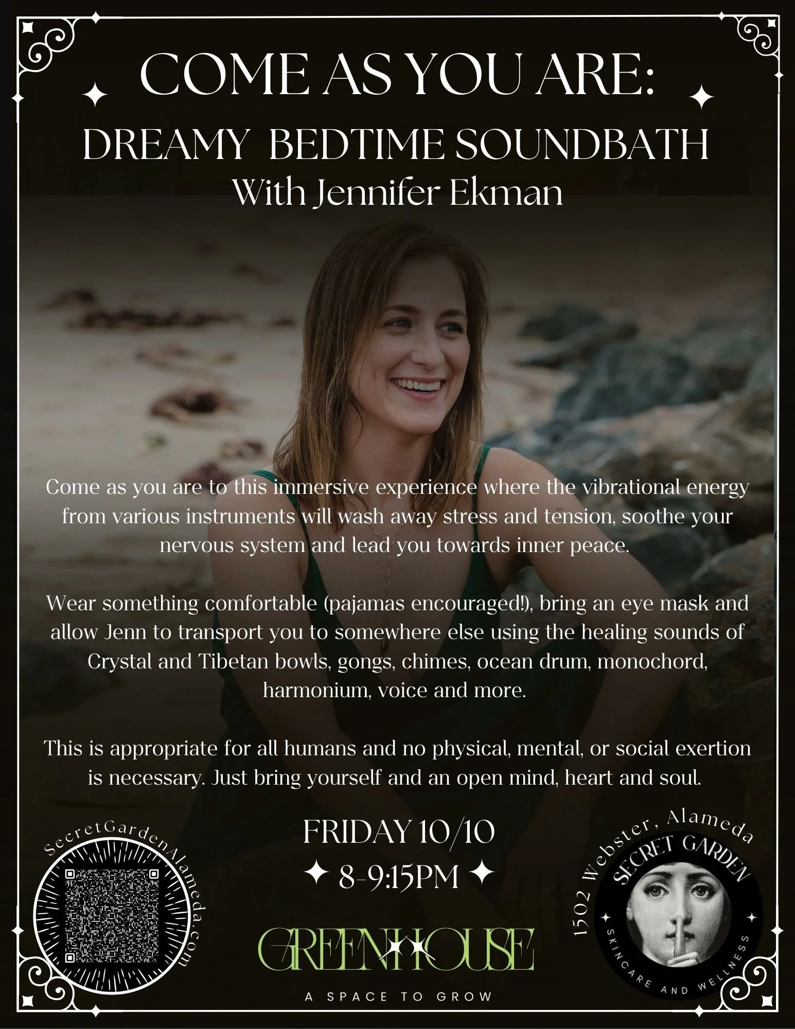 Wear something comfortable (pajamas encouraged!), bring an eye mask and allow Jenn to transport you to somewhere else using the healing sounds of Crystal and Tibetan bowls, gongs, chimes, ocean drum, monochord, harmonium, voice and more.